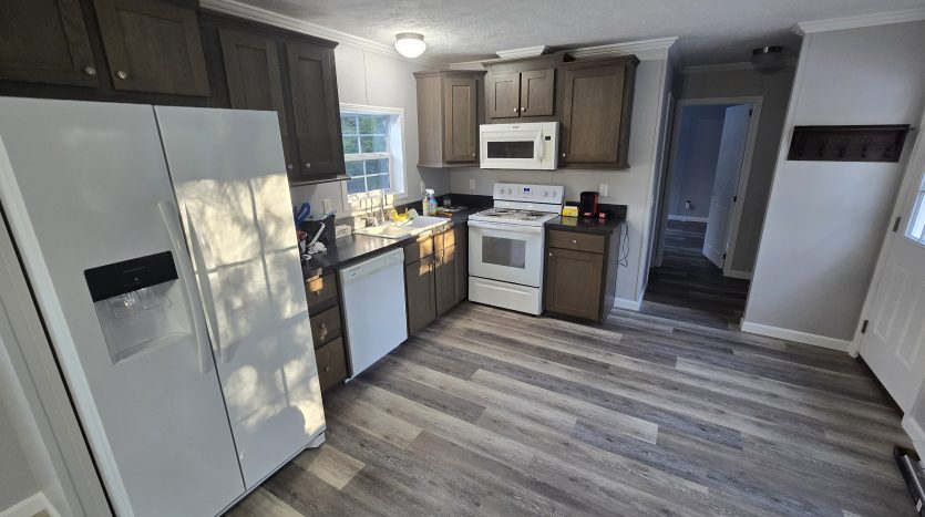 Just setup on new lot that sits way back from the road in Nice private location and super rare that owner is including heat and snowplowing. Also just having high speed Spectrum internet run this week so will be ready for its new occupant. Home has lot that is treed all around it yet has good parking and nice oversized deck for outdoor area too. It’s open floor plan with living, Dining and kitchen. Kitchen has large side by side fridge, dishwasher and over range microwave above the range. No carpets anywhere as owner just installe all new luxury vinyl flooring and home has 2 full baths too. Nice setup as bedrooms are at opposite ends of home and the master bath has the extra large step in shower with seat for easy access too. Price is $1650 or 1 or $1700 if 2 or 3 so very affordable since owner pays Heat and snowplowing plus water is private so no cost for water or sewer. Be the 1st tenant in this home and pets negotiable so don’t wait